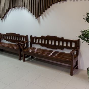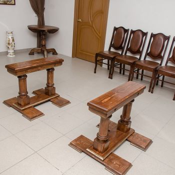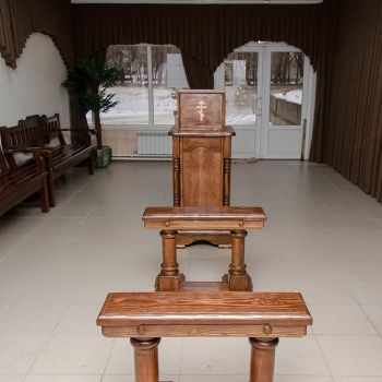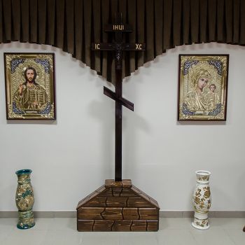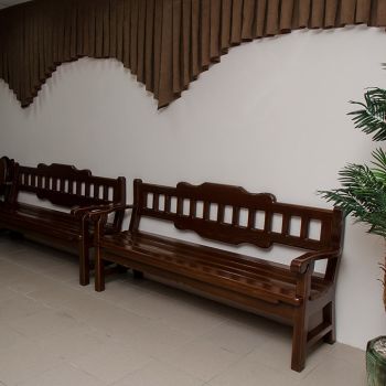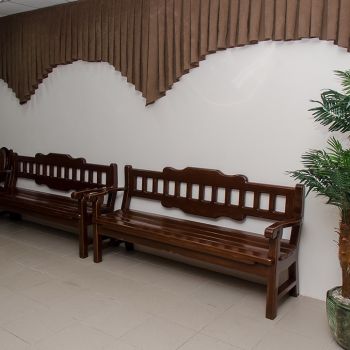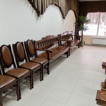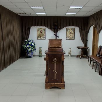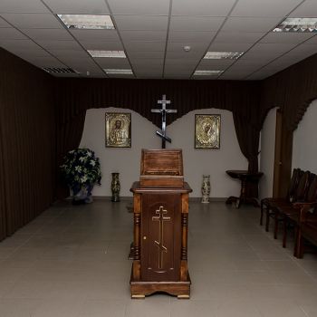 Ритуальный зал оборудован стационарным постаментом для гроба с телом, сиденьями для родственников, подставками для венков и портрета.